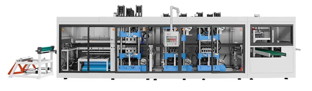 الآلة مُجهزة بنظام تحكم PLC وواجهة تشغيل بشاشة لمس، مما يُتيح للمستخدمين ضبط وتعديل مُعاملات الإنتاج بسهولة، مثل درجة حرارة التسخين، ووقت التشكيل، وسرعة القطع. يُقلل نظام التغذية والتسخين والتشكيل والتبريد والقطع والتكديس الأوتوماتيكي بالكامل من التشغيل اليدوي، ويُقلل من صعوبة التشغيل وتكاليف الموظفين. كما يُمكن لنظام التحكم الذكي مُراقبة حالة تشغيل المعدات آنيًا، مع وظائف تشخيص الأعطال والإنذار التلقائي، مما يُعزز استقرار وسلامة تشغيل المعدات.