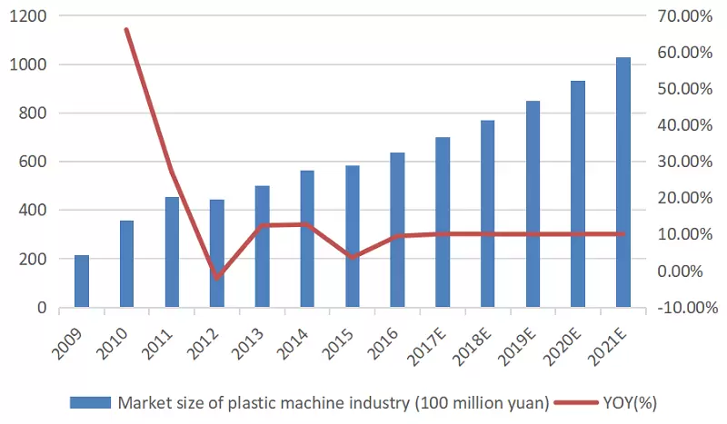 من تحليل سوق المنتجات البلاستيكية، إلى جانب الاستفادة الكاملة من الطاقة الإنتاجية الأصلية لمنتجات الآلات البلاستيكية في بلدي، من عام 2001 إلى عام 2010، يبلغ متوسط معدل النمو السنوي لقدرة السوق المحلية لمنتجات الآلات البلاستيكية في بلدي حوالي 6٪. في عامي 2000 و2005، كان 8 مليارات يوان و11 مليار يوان على التوالي، ومن المتوقع أن يصل إلى 14.5 مليار يوان في عام 2010. مع تحسن جودة المنتج في بلدي وزيادة الأصناف، ستزداد أيضًا حصة منتجات الآلات البلاستيكية في السوق المحلية، والتي من المتوقع أن تكون 70٪ و75٪ و80٪ على التوالي؛ ويبلغ إجمالي قيمة الناتج الصناعي لمنتجات الآلات البلاستيكية 5.6 مليار يوان و8.25 مليار يوان و11.6 مليار يوان. مع زيادة صادرات منتجات بلدي، من المتوقع أن يصل إجمالي قيمة الناتج الصناعي لمنتجات الآلات البلاستيكية في بلدي في عام 2010 إلى 14 مليار يوان، أي 2.33 مرة من عام 2000، مع معدل نمو سنوي متوسط يبلغ حوالي 9٪، منها معدل النمو من عام 2001 إلى عام 2005 هو 10٪، ومعدل النمو من عام 2006 إلى عام 2010 كان 8٪.